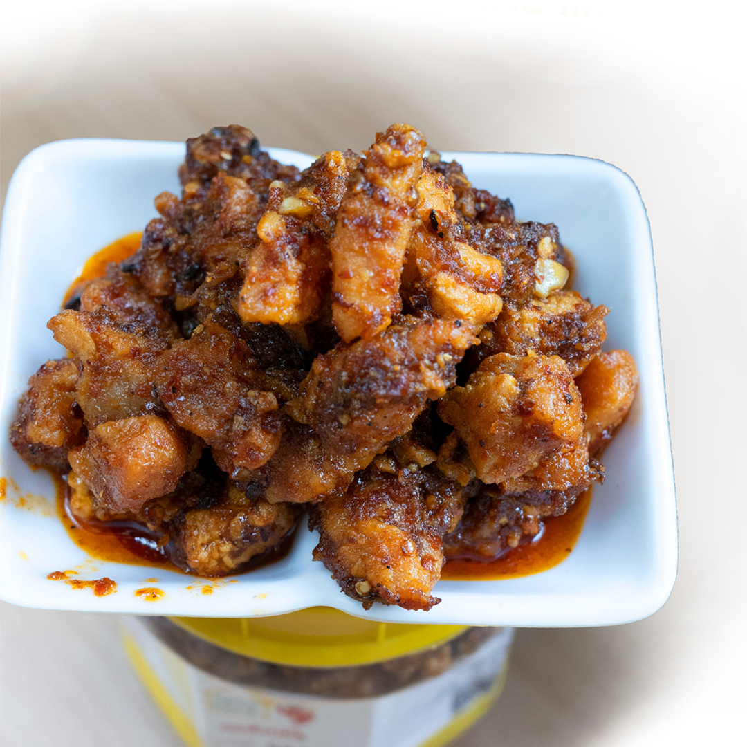 Delicious Chicken Achar made with deep-fried boneless chicken chunks, marinated in premium. Nepali spices and locally produced mustard oil.